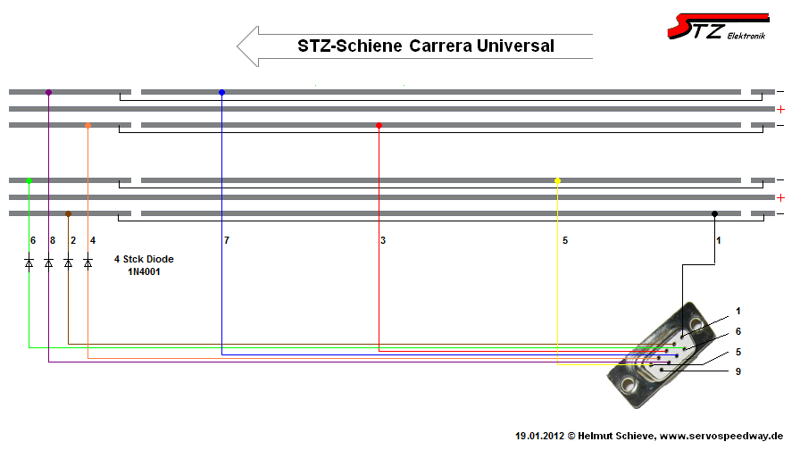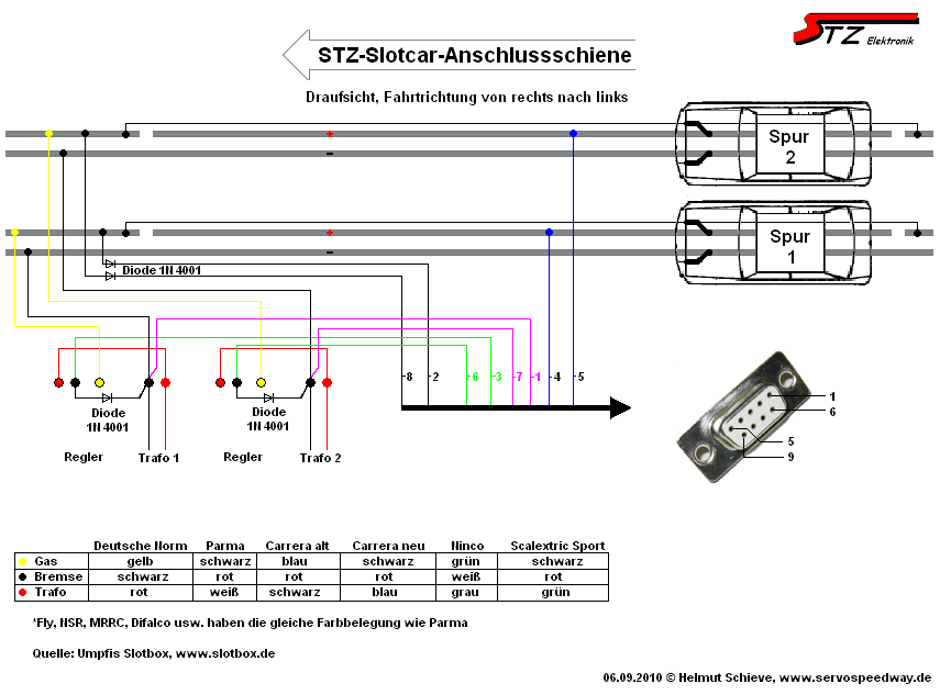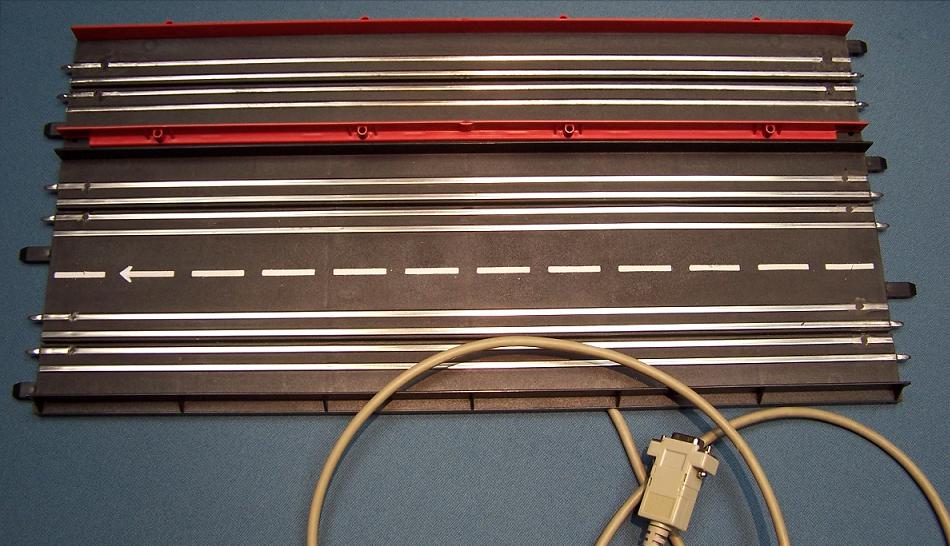 Zur Unterbrechung der Leiterbahn eignet sich eine “Laubsäge” ganz hervorragend. Die Sägeblätter sind speziell für Hartmetall und in jedem gutsortierten Baumarkt zu bekommen. Rechts oder links neben der Leiterbahn wird ein kleines Loch gebohrt durch das dann das Sägeblatt gesteckt werden kann. Hier ein Variante in Servo 160 Diese Schiene ist mit dem o.g. Stecksystem ausgestattet. Hier eine Varinate für eine Boxengasse aus einspurigen Supersprung Schienen. Die Einspurige ist in diesem Fall kaskadiert, es brauchen also nur die Impulsstücke verbunden werden. ![]() Diese Schiene ist fest mit dem Anschlusskabel verbunden, also das aufwendige Stecksystem entfällt. ![]() Hier eine Variante in 132. Da die Schiene “dicker” ist, ist hier das Stecksystem etwas anders. Von den 10 mögliche Anschlüssen sind natürlich nur 8 belegt. Hier eine einspurige 132er STZ-Schiene während der Bauphase. Hier die Variante für die Slotter.(nicht digital) Wichtig! Die Bahn muss der internationalen Norm entsprechen (Carrera ist manchmal anders). Der Pluspol ist in Fahrtrichtung gesehen rechts. Die Regelung ist ebenfalls positiv, d.h. der Pluspol geht durch den Regler. Der Minuspol geht vom Netzteil direkt an den linken Schleifer des Autos, und wird beim Bremsen über den Regler dann auch auf den rechten Bahnstromleiter gelegt. Das Auto wird im Prinzip kurzgeschlossen. ![]() Hier ein kleines Filmchen für die Slotter Es handelt sich hier um eine abgespeckte Version der STZ-Technik. Es ist lediglich eine Zeitmessung und ein Tankfunktion integriert. Da ich hier auf eine Bahnstromabschaltung, Ampel usw. verzichtet habe, passt die gesamte Schaltung in einen Parallelportstecker. tzt neu ist die Variante für die UNI-Fahrer, hier die Impulsschiene: Mit dieser Schiene können zwei Autos Zeitmessen und Tanken. Es wäre auch eine 4-Fahrzeugmessung auf 2 Spuren möglich, aber so fährt wohl keiner Zusätzlich müssen in der Anschlussschiene zwei Widerstände eingelötet werden!