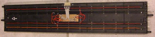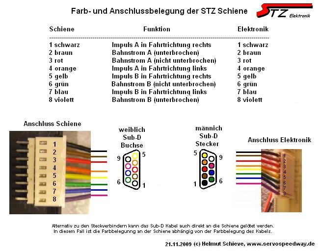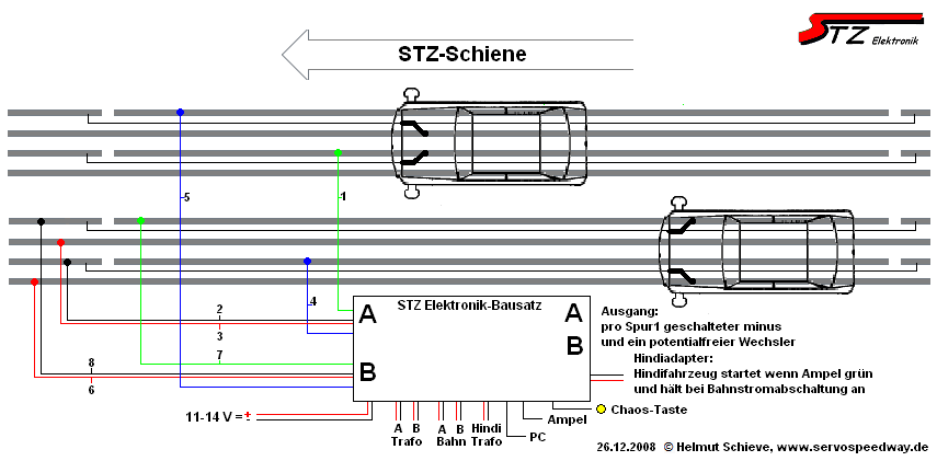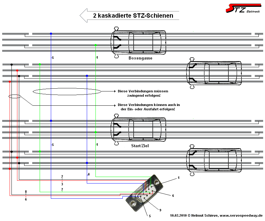Zur Unterbrechung der Leiterbahn eignet sich eine “Laubsäge” ganz hervorragend. Die Sägeblätter sind speziell für Hartmetall und in jedem gutsortierten Baumarkt zu bekommen. Rechts oder links neben der Leiterbahn wird ein kleines Loch gebohrt durch das dann das Sägeblatt gesteckt werden kann. Hier ein Variante in Servo 160 Diese Schiene ist mit dem o.g. Stecksystem ausgestattet. Hier eine Varinate für eine Boxengasse aus einspurigen Supersprung Schienen. Die Einspurige ist in diesem Fall kaskadiert, es brauchen also nur die Impulsstücke verbunden werden. ![]() Diese Schiene ist fest mit dem Anschlusskabel verbunden, also das aufwendige Stecksystem entfällt. ![]() Hier eine Variante in 132. Da die Schiene “dicker” ist, ist hier das Stecksystem etwas anders. Von den 10 mögliche Anschlüssen sind natürlich nur 8 belegt. Hier eine einspurige 132er STZ-Schiene während der Bauphase. Hier die Variante für die Slotter.(nicht digital) Wichtig! Die Bahn muss der internationalen Norm entsprechen (Carrera ist manchmal anders). Der Pluspol ist in Fahrtrichtung gesehen rechts. Die Regelung ist ebenfalls positiv, d.h. der Pluspol geht durch den Regler. Der Minuspol geht vom Netzteil direkt an den linken Schleifer des Autos, und wird beim Bremsen über den Regler dann auch auf den rechten Bahnstromleiter gelegt. Das Auto wird im Prinzip kurzgeschlossen. ![]() Hier ein kleines Filmchen für die Slotter Es handelt sich hier um eine abgespeckte Version der STZ-Technik. Es ist lediglich eine Zeitmessung und ein Tankfunktion integriert. Da ich hier auf eine Bahnstromabschaltung, Ampel usw. verzichtet habe, passt die gesamte Schaltung in einen Parallelportstecker. tzt neu ist die Variante für die UNI-Fahrer, hier die Impulsschiene: Mit dieser Schiene können zwei Autos Zeitmessen und Tanken. Es wäre auch eine 4-Fahrzeugmessung auf 2 Spuren möglich, aber so fährt wohl keiner Zusätzlich müssen in der Anschlussschiene zwei Widerstände eingelötet werden!
